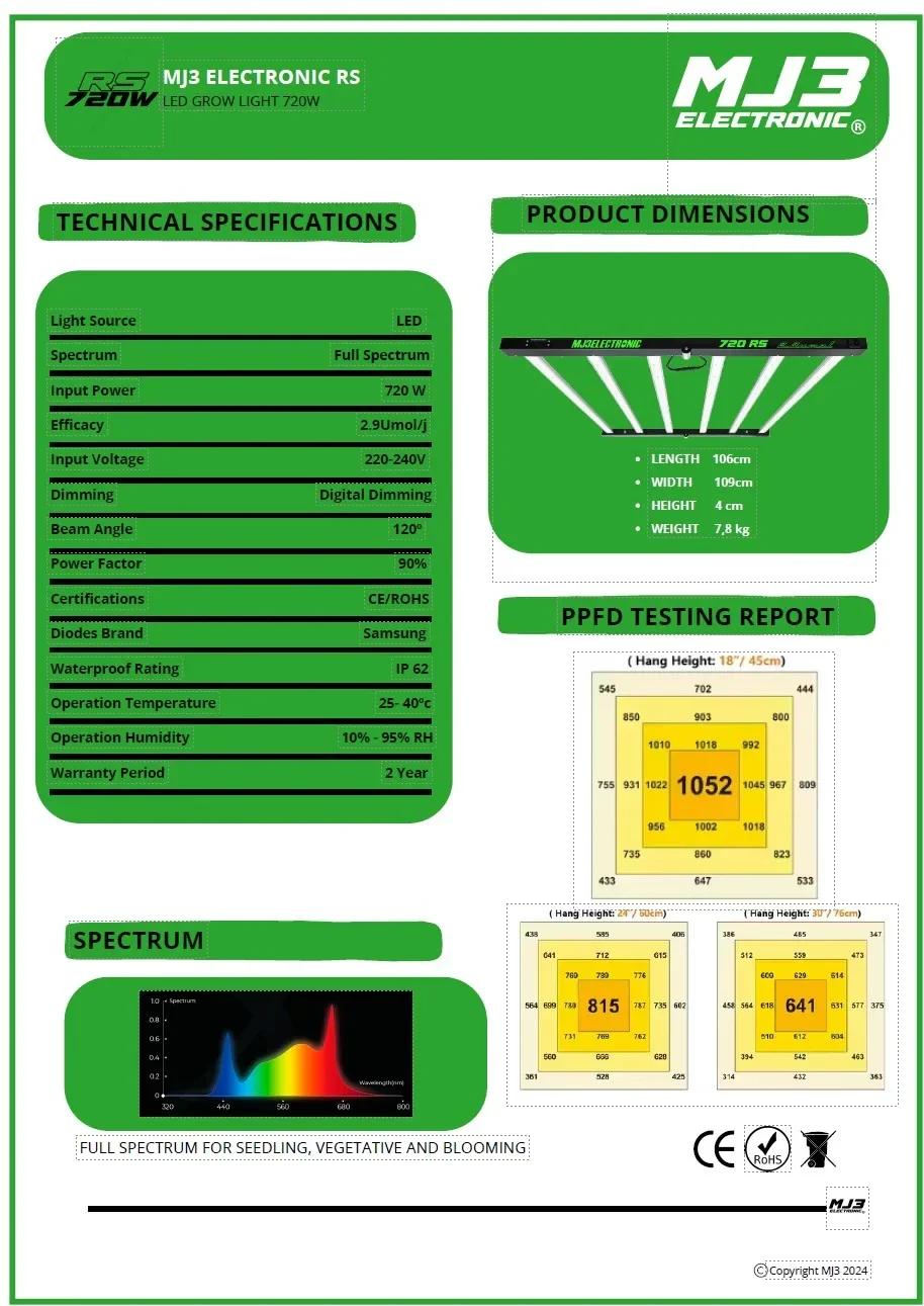 Dank integriertem Treiber, hoher Effizienz von 2,9 µmol/J und einem präzisen 4-Stufen-Dimmsystem bietet die MJ3 720W RS alles, was für ein professionelles und kontrolliertes Pflanzenwachstum erforderlich ist.