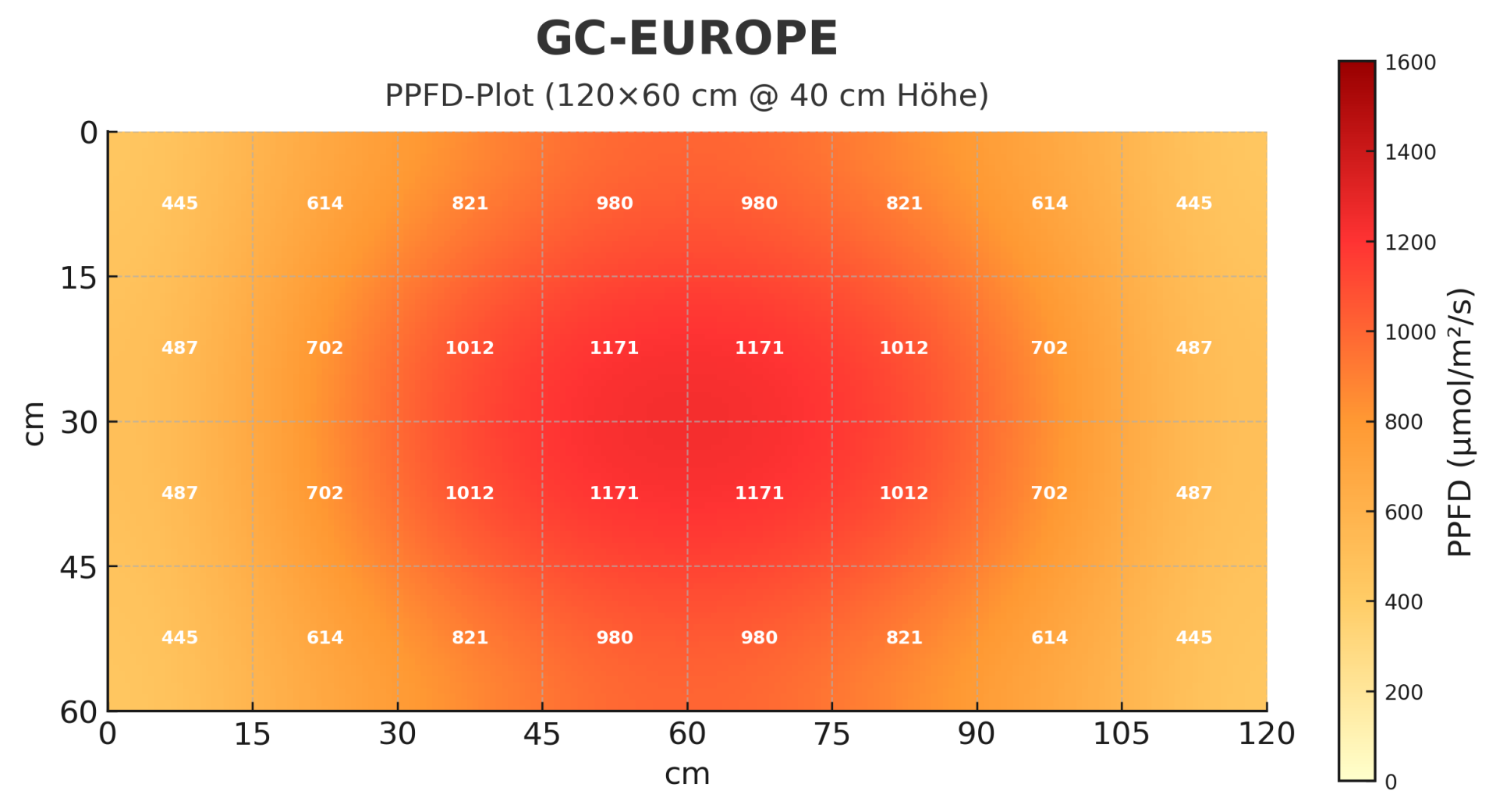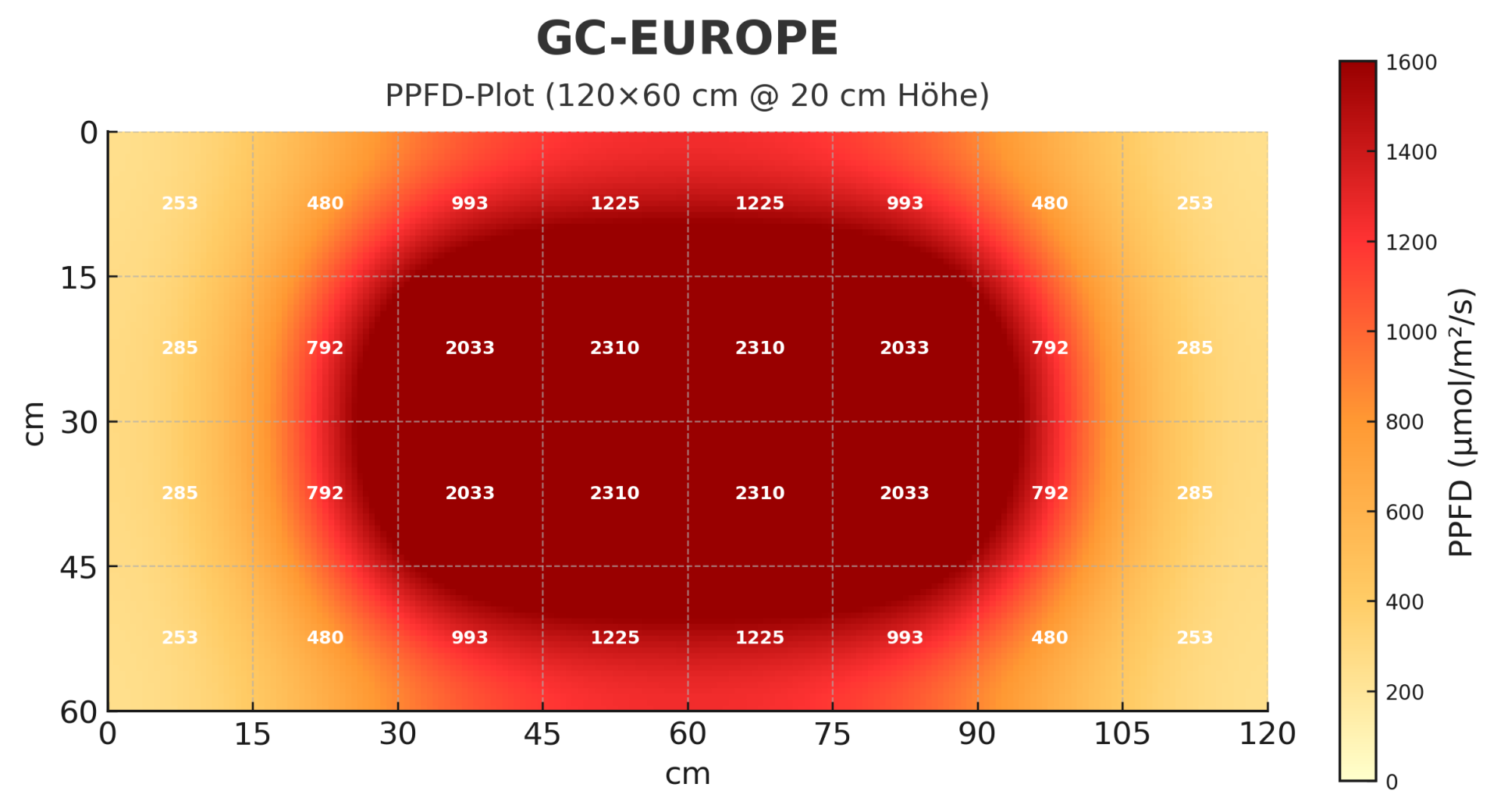 Die Greenception GC-Europe 250W ist eine hochwertige LED-Growlampe „Made in Europe“, speziell ausgelegt auf Grow-Flächen von ca. 0,6 m² bis 1 m² – ideal für Anbauflächen wie 80×80 cm, 90×90 cm oder 100×100 cm.