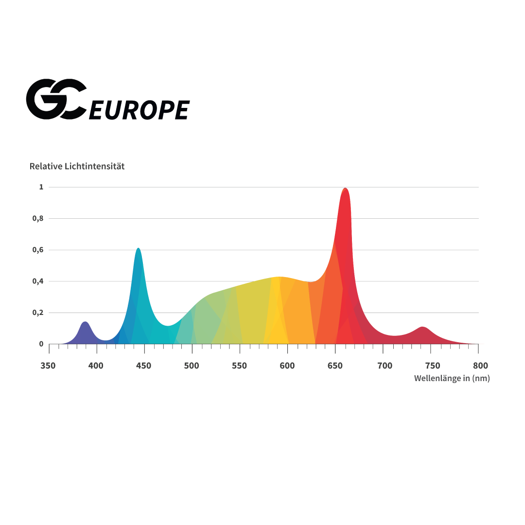 Dank eines Spektrums von 365 nm bis 780 nm inkl. UV & Far-Red deckt die Lampe alle Phasen ab – von Steckling über Vegitation bis zur Blüte.
