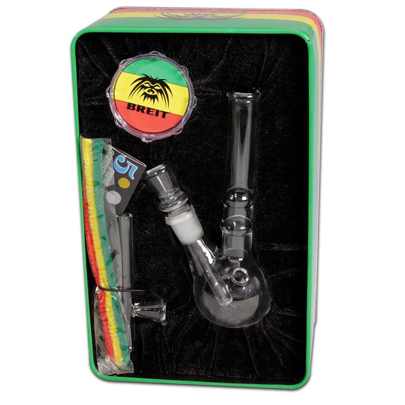 Die tolle Metalldose im Rastadesign und mit dem coolen BREIT-Logo enthält eine Minibong aus Glas mit Kickloch, eine Kawummpfeife im Miniformat, einen 2tlg. Grinder aus Acryl, 5 Ersatzsiebchen und 3 Pfeifenreiniger, ebenfalls in den Farben der Rastafari. Das Shillum der kleinen Bong hat einen Kräuterkopf mit akzeptablem Fassungsvermögen. Die Kawumm ist ebenfalls aus Glas und lässt sich leicht reinigen.