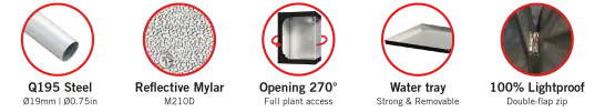 Die «großen» Hydro Shoot, die für Pflanzen mit einer Höhe von 50cm bis 150cm, gedacht sind, bieten Anbauflächen von 1.44m2 bis 18,00m2. Sie sind leicht aufzubauen und verfügen über eine Tür, die so angebracht ist, dass man drei Seiten des Zeltes vollständig öffnen kann und einen einfachen Zugriff auf die Pflanzen hat. Sie verfügen über reflektierende Socken für die Luftein- und Auslässe, aber Sie können auch unser DUCTING FLANGE DF16 verwenden, um neue Ein- oder Auslässe anzulegen. Die Zelte werden ohne Zubehör angeboten und können mit unseren Zubehörteilen und Peripheriegeräten ergänzt werden, die speziell für alle unsere Pflanzenzelte entwickelt wurden. Unsere Konfigurationstipps für die Belüftung, Beleuchtung und Luftableitung sind für die intensive Kultur Stufe III gedacht, für Pflanzen, die die Sonne lieben. Teilen Sie diese Werte für Kulturen der Stufe II und I durch 2 bzw. durch 4.